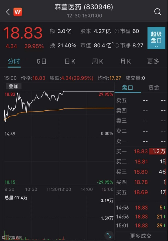 沪深两市超百股涨停的火热气氛也带动了北交所股票。今日北交所股票中鹿得医疗、大唐药业、森萱医药三只股票上演“30CM”涨停,均为医药生物行业股票。
