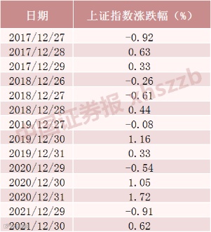 2021年仅剩一个交易日。数据显示,近几年,上证指数在年末最后3个交易日均出现同一现象,即倒数第三个交易日上证指数下跌时,最后两个交易日往往上涨。昨日上证指数下跌0.91%,今日上涨0.62%,明日会如何?