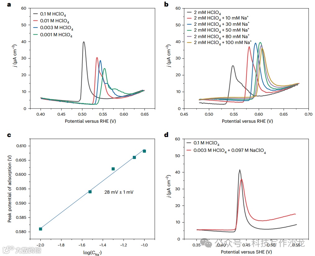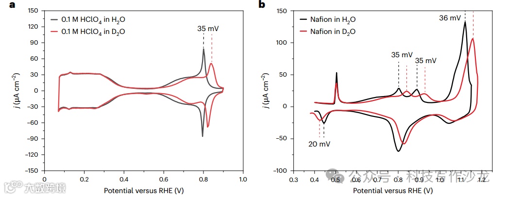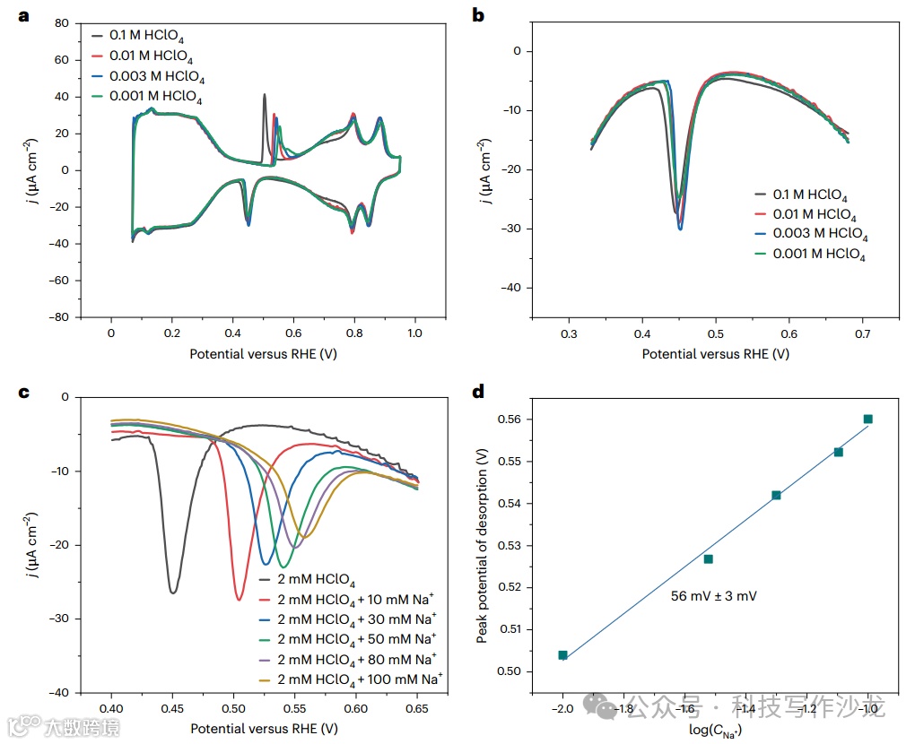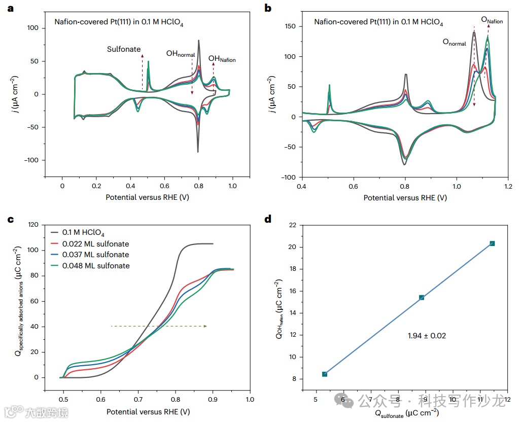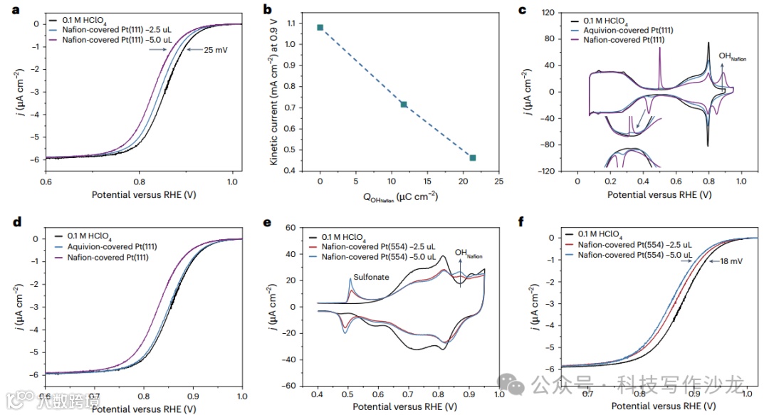 3、动力学分析:通过对比不同条件下ORR活性的变化,揭示了OHNafion和ONafion物种对ORR动力学的负面影响。实验结果表明,Nafion覆盖的Pt(111)表面的ORR活性显著降低,这与OHNafion和ONafion的动力学行为密切相关。