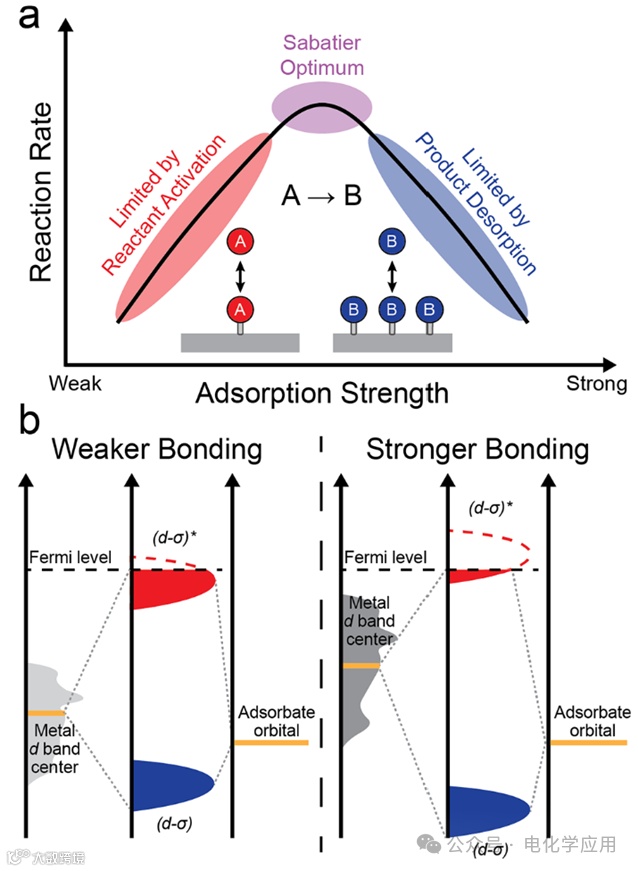图1. (a) 萨巴蒂尔原理的示意图,展示了当吸附强度适中时,反应速率将达到最优。(b) 示意图说明了费米能级与d轨道中心之间的差异对反键轨道填充的影响机制。