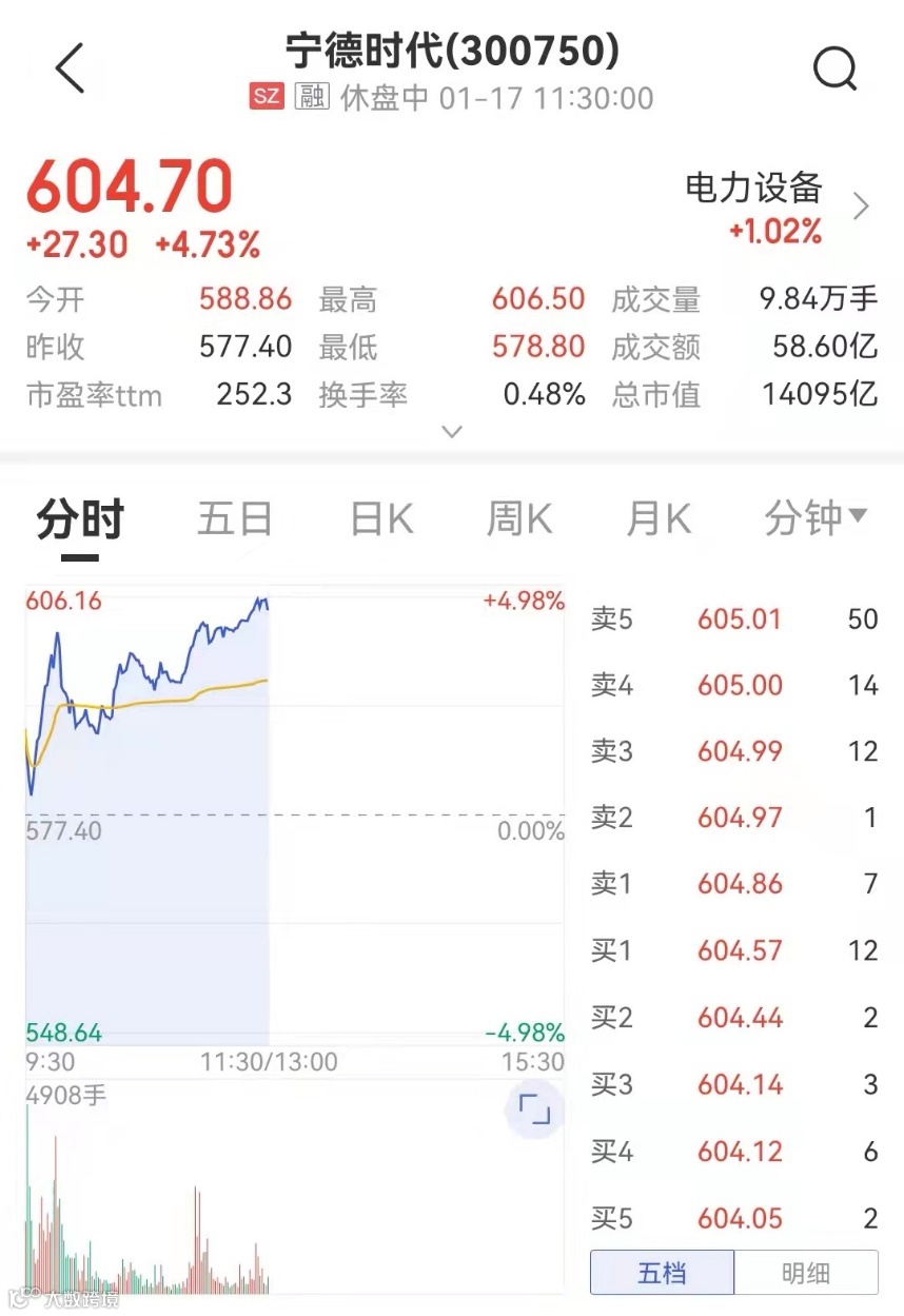 今日上午,宁德时代早盘涨超4%,收复600元/股关口,截至收盘上涨4.73%,报604.7元/股,总市值为1.4万亿元。Wind数据显示,从1月11日至17日午间收盘,近一周的时间,宁德时代已涨超12%。