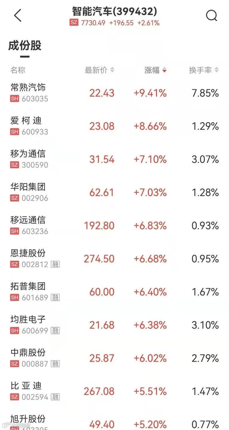此外,智能汽车产业链走强。常熟汽饰涨超9%,华阳集团、移为通信、爱柯迪涨超7%,均胜电子、恩捷股份、拓普集团等跟涨。
