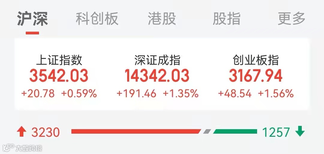 截至午间收盘,上证指数上涨0.59%,深证成指上涨1.35%,创业板指上涨1.56%。