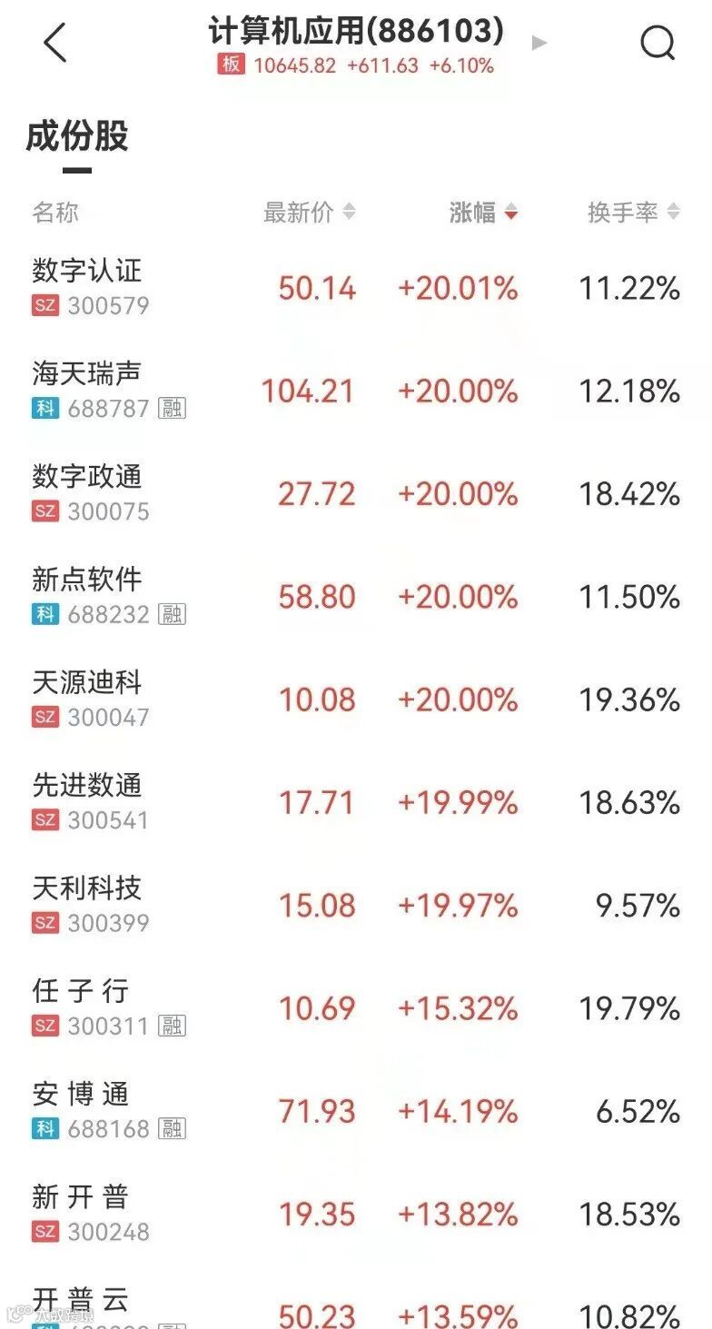 计算机应用股掀涨停潮,数字认证、海天瑞声、天源迪科、数字政通、新点软件、先进数通、天利科技均20CM涨停,延华智能、金财互联、华胜天成等同样封板。