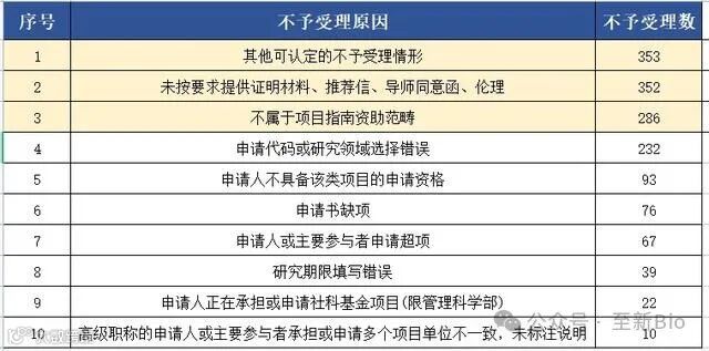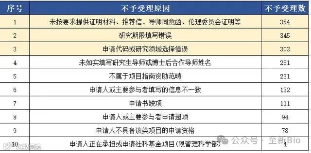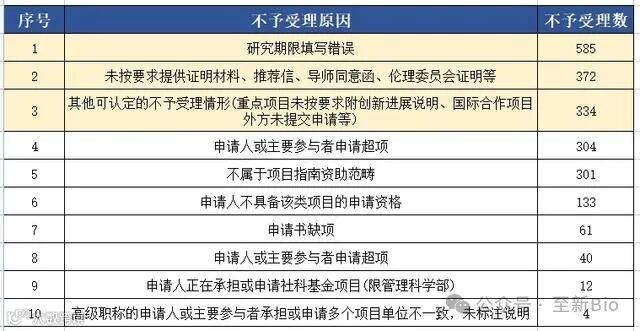 2023年国自然项目不予受理原因:317691项申请中不予受理1503项,占比0.47%,排名前十位的原因如下: