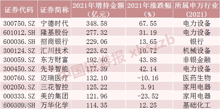 北向资金2021年加仓金额前十股