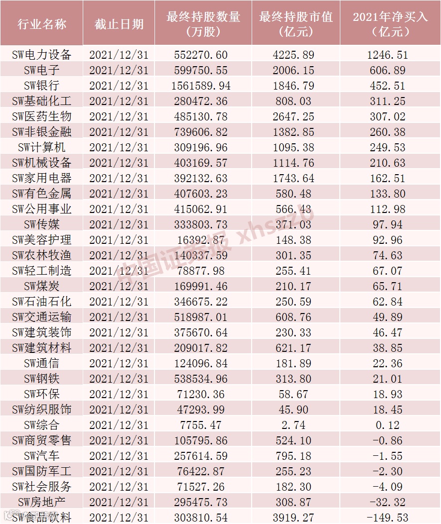2021年北向资金对各行业增减持情况