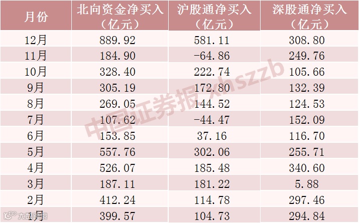 北向资金2021年各月净流入情况