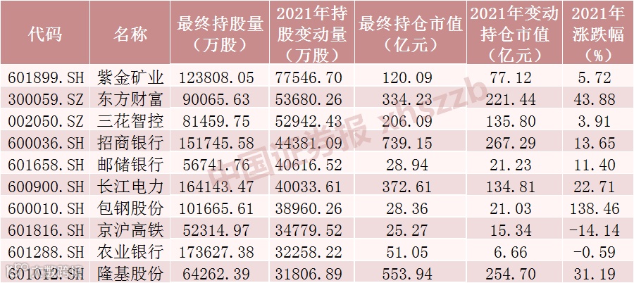 2021年北向资金持股增加数前十股