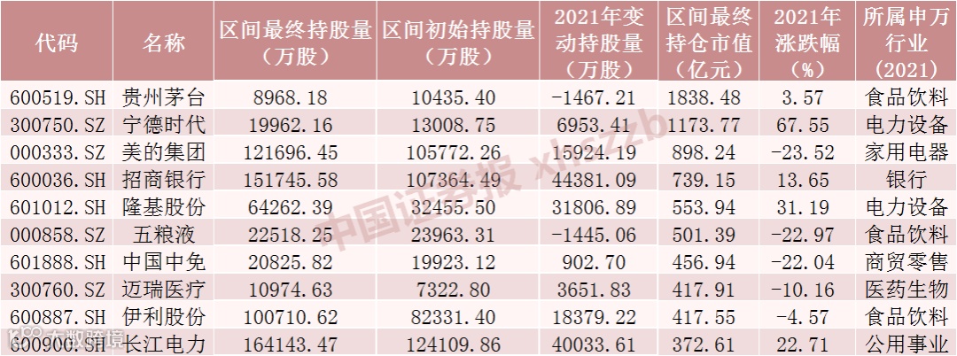 北向资金2021年末十大重仓股