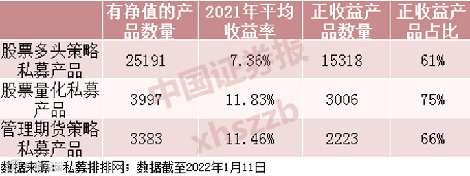 第三方机构公布的2021年国内证券私募“成绩单”数据显示,该机构监测的25191只股票多头策略私募产品,2021年全年的平均收益率为7.36%。其中,全年盈利私募产品数量15318只,占比61%。其他主流策略私募产品中,2021年股票量化私募产品平均盈利11.83%,盈利产品占比75%;CTA策略私募产品2021年平均净赚11.46%,其中66%的产品实现全年盈利。