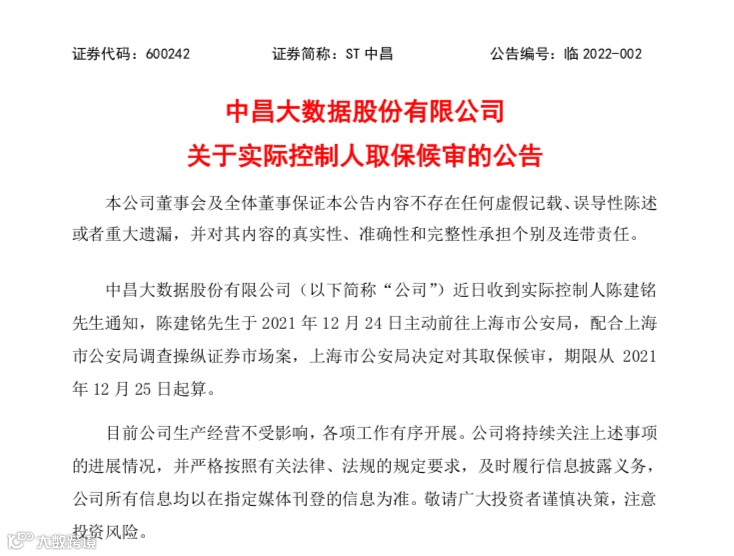 ST中昌1月7日晚公告称,公司实际控制人陈建铭于2021年12月24日主动前往上海市公安局,配合上海市公安局调查操纵证券市场案,上海市公安局决定对其取保候审,期限从2021年12月25日起算。ST中昌称,目前公司生产经营不受影响,各项工作有序开展。