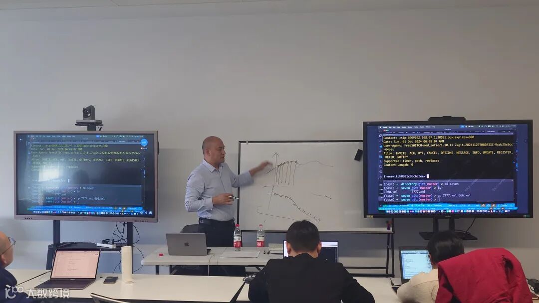 随后,杜老师深入讲解了 FreeSWITCH 的高级配置实例,包括路由设置、网关配置、多租户管理以及 SIP 呼叫流程分析。通过现场演示和源码解析,学员们对 FreeSWITCH 的呼叫流程有了更为深入的理解,为实际应用中的问题排查和功能扩展提供了坚实的理论基础。