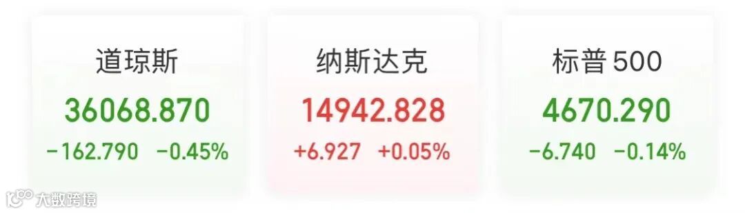 周一,美股三大指数收盘涨跌不一,纳指收涨0.05%,盘初一度重挫2.7%;道指跌0.45%,标普500指数跌0.14%。