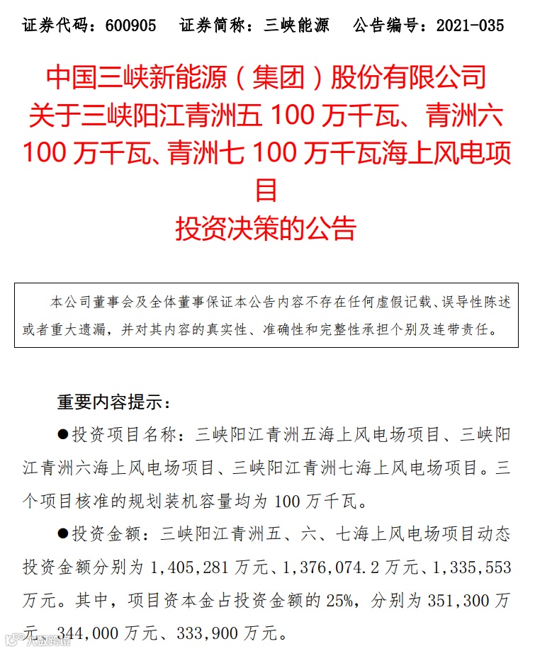 12月20日晚,三峡能源公告,拟投资建设三峡阳江青洲五海上风电场项目、三峡阳江青洲六海上风电场项目、三峡阳江青洲七海上风电场项目,三个项目核准的规划装机容量均为100万千瓦。
