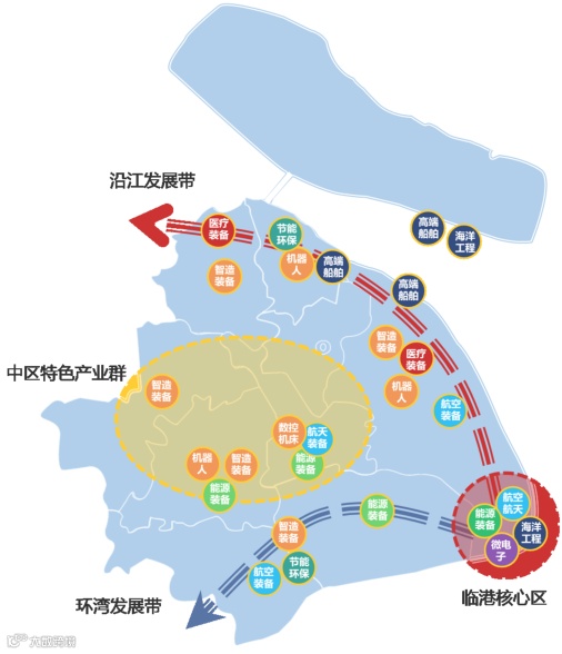 上海将形成沿江和环湾两大高端装备集聚发展带。沿江发展带主要包括浦东新区、宝山区、嘉定区和崇明区等,重点布局智能制造装备、民用航空装备、船舶海工装备、高端能源装备、高端医疗装备等产业。环湾发展带主要包括奉贤区、金山区等,重点布局智能制造装备、民用航空装备、高端能源装备等产业。