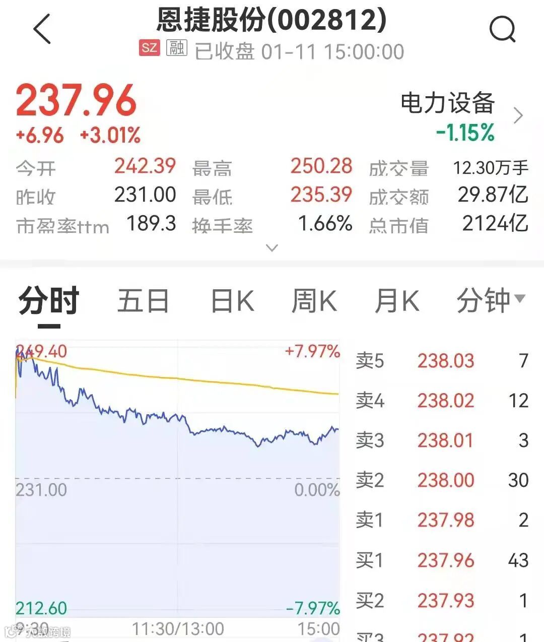 1月11日,恩捷股份开盘大涨,涨幅一度逼近8%,收报237.96元/股,涨幅为3.01%。