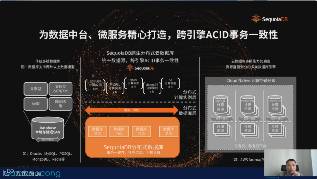 支撑不同的数据库其实已经在各种云数据库中得到了实现,但是在现实中不同的数据库是不能互相访问数据的,但是巨杉数据库现在已经在进行探索,传统的数据库只有一台无法横向扩充容易遇到瓶颈。云数据库可以进行横向扩充但是由于不同的技术或品牌导致数据独立,数据交互或者共享比较困难。