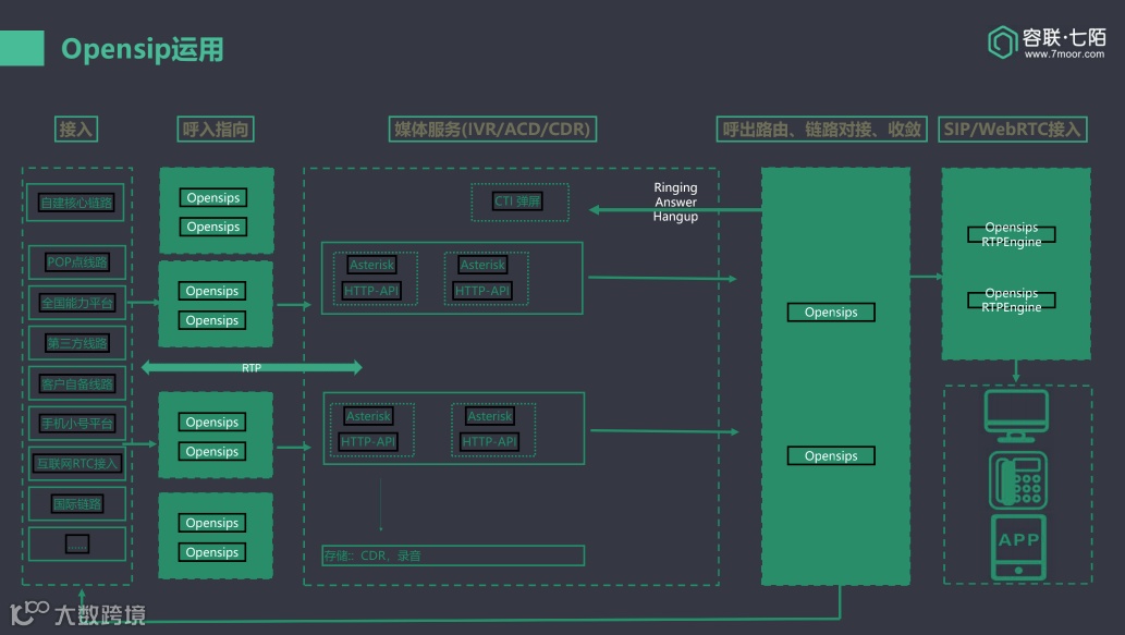 对于呼入呼出,OpenSIPS 对上承载各个平台或者进来的呼叫,对下是对接各个落地网关起到了枢纽的作用。在以上的系统架构中OpenSIPS 负责了呼出的路由,同时也负责了信令的采集,使用异步HTTP服务队列来完成界面上的弹屏等事件消息。