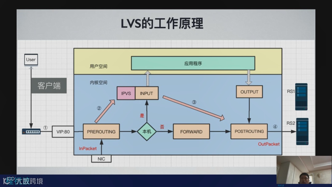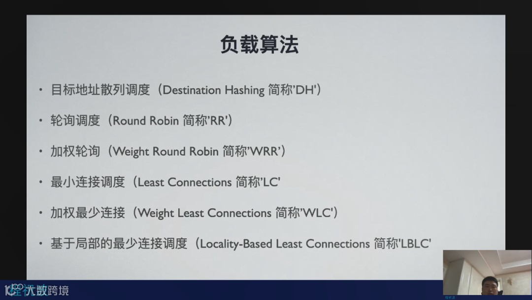 介绍完组成部分,程老师给大家介绍了LVS的三种工作模式:基于NAT的LVS负载均衡、基于Tunnel的LVS负载均衡以及基于Direct Routing的LVS负载均衡。同时介绍了负载算法。在演讲的最后介绍了关于LVS的命令设置以及三种拨号规则。