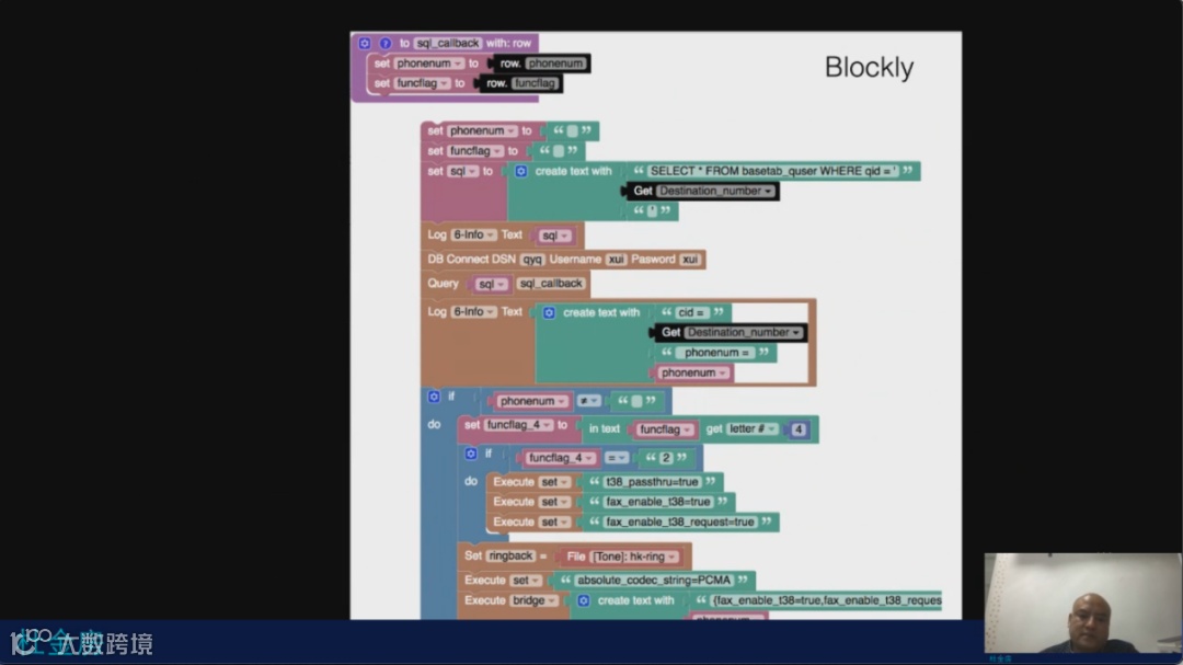 接下来杜老师就给我们分享了Lua在FreeSWITCH中的普遍使用。举例了Lua对JSON的操作/Verto HTTP Server等的操作,也添加了xdb完成增删改查。使用了Google 的Blockly实现了积木功能,使用搭积木搭建代码逻辑。