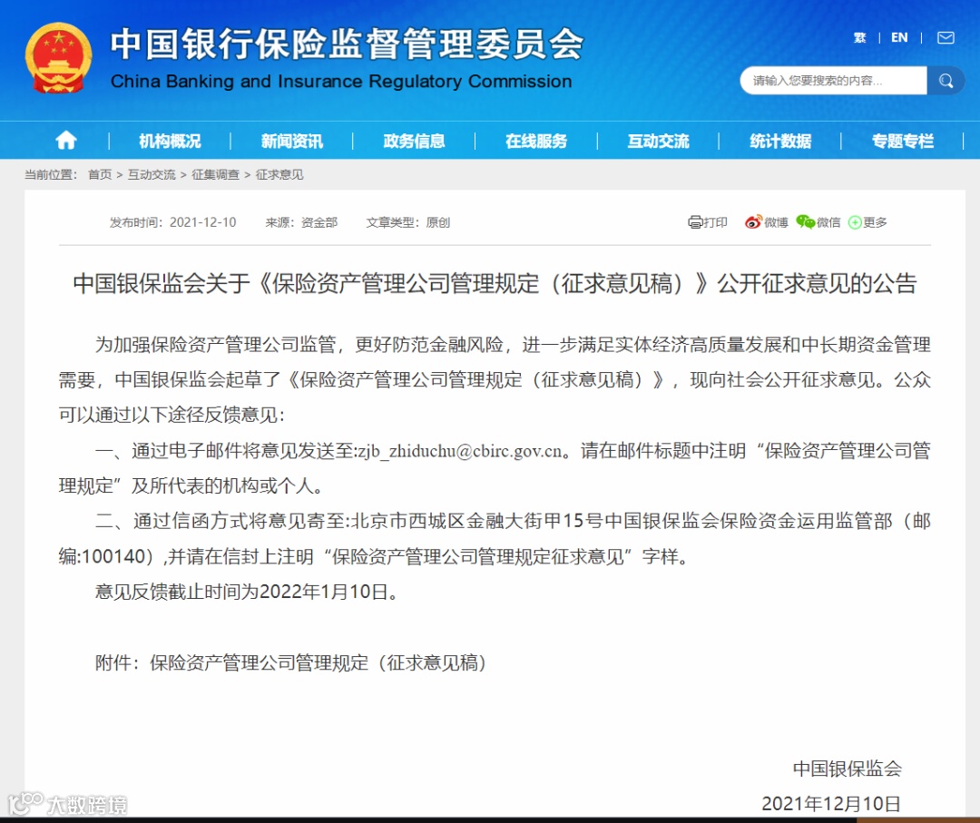 银保监会网站12月10日消息,银保监会发布《保险资产管理公司管理规定(征求意见稿)》。