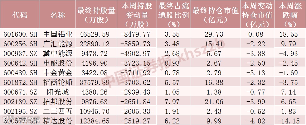 本周北向资金减仓股数前十股