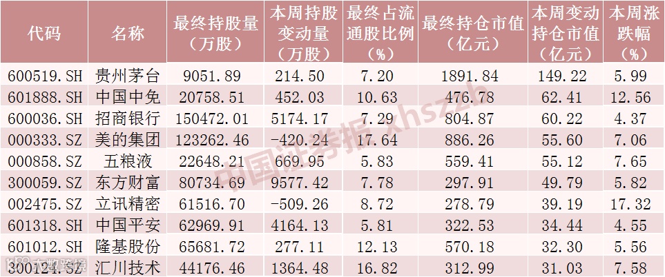 本周北向资金持股增加数前十股