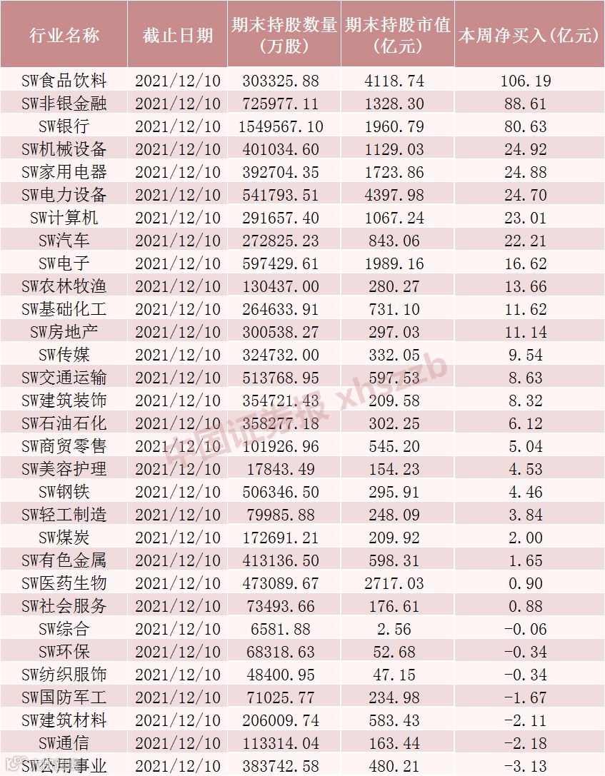 本周北向资金行业调仓情况