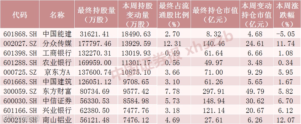 从市场表现情况来看,本周北向资金持股增加数居前十股中除中国能建下跌5.05%外,其他股票均上涨,南山铝业涨幅最大,累计上涨12.07%。