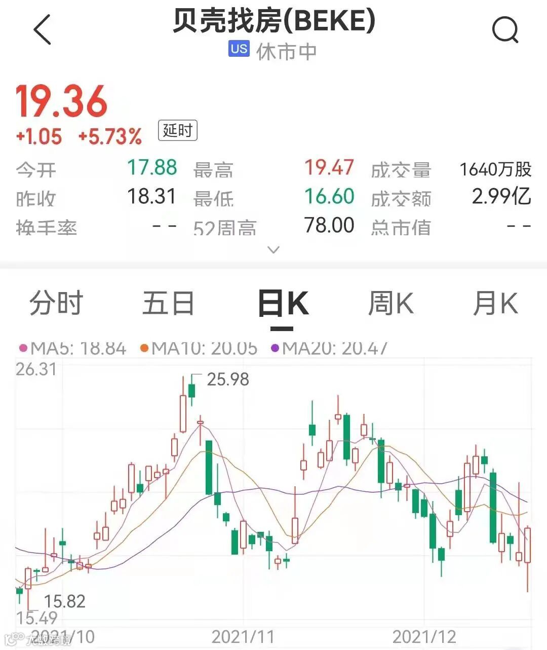 美股贝壳(BEKE)周五股价出现反弹。截至收盘,贝壳收报19.36美元/股,涨幅为5.73%。