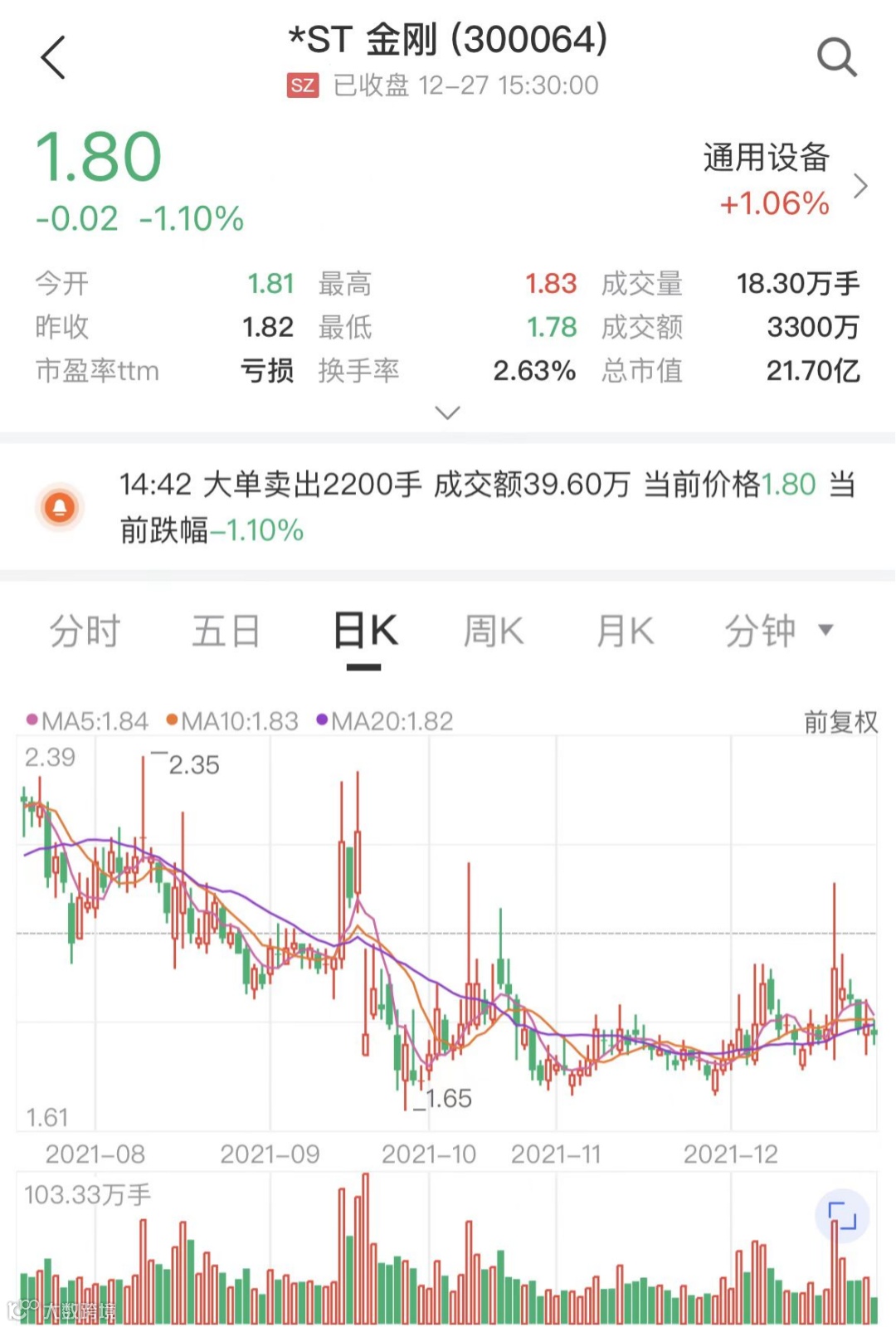 12月27日晚,*ST金刚发布了自9月以来的第14份公司股票可能被实施重大违法强制退市风险提示公告。截至2021年12月27日收盘,*ST金刚报1.8元/股,从2015年6月15日的高点21.97元/股(前复权)至今,公司股价已跌去九成。