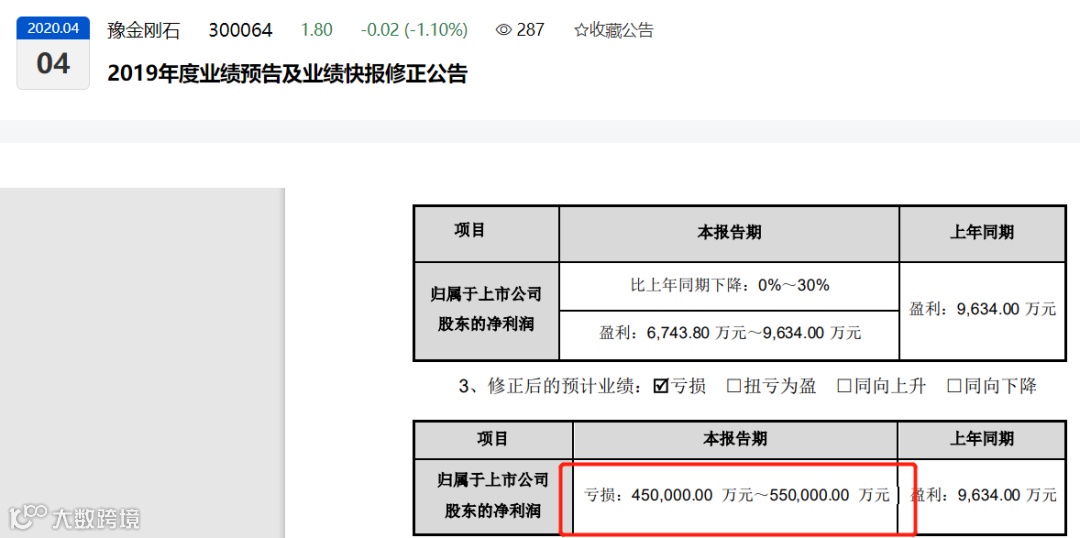 *ST金刚2020年4月30日正式发布的2019年年报显示,公司亏损51.97亿元。而2010年-2018年,公司累计盈利仅10.61亿元。