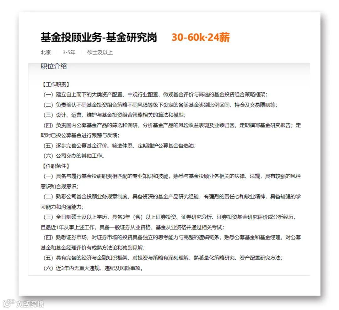 另一则广发证券的招聘信息显示,对公募基金研究岗(债券方向)的职责要求是债券信用风险分析和识别、筛选债券基金管理人,以及FOF业务债券基金投资组合研究工作、定期追踪基金管理人及产品情况等。