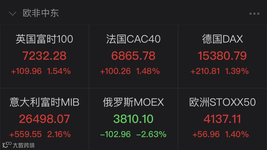 欧洲主要股指表现也不逊色。德国DAX指数涨1.39%,报15380.79点;法国CAC40指数涨1.48%,报6865.78点;英国富时100指数涨1.54%,报7232.28点;意大利富时MIB指数涨2.16%,报26498.07点。