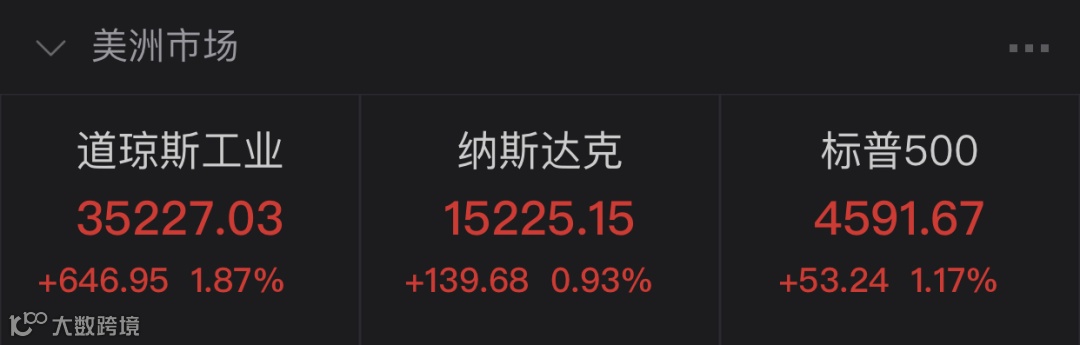 12月6日,美三大股指全线收涨。道指涨646.95点,涨幅1.87%,报35227.03点;标普500指数涨1.17%,报4591.67点;纳指涨0.93%,报15225.15点。