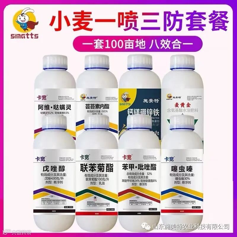 “一喷三防”的喷施时期是在小麦抽穗开始至灌浆期。这一时期的病害主要有白粉病、锈病、纹枯病、赤霉病等。防治小麦锈病、白粉病的主要农药有三唑酮、烯唑醇、戊唑醇、氟环唑、已唑醇、腈菌唑、丙环唑等等。防治赤霉病的药剂主要有氰烯菌酯、烯肟·多菌灵、戊唑醇、咪鲜胺、多菌灵等。