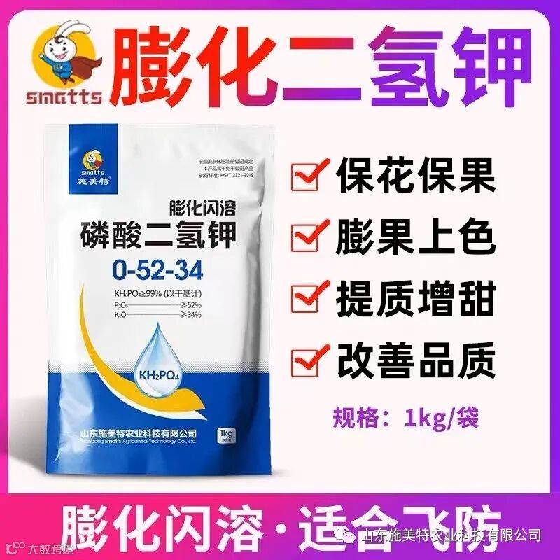磷酸二氢钾是一种高含量的磷钾肥,具有使用方便、见效快、效果好、作用多、无毒、无害、无残留等许多优势,