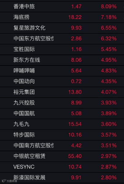 截至当日收盘,旅游股中,香港中旅涨逾8%,复星旅游文化涨逾6%。航空股中,中国东方航空股份涨逾6%,中国国航涨近4%,中国南方航空股份涨逾3%。