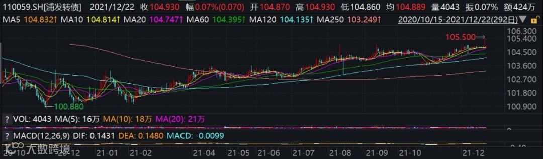 2021年,浦发转债始终稳坐“钓鱼台”。截至目前,其今年最高价为105.50元,最低价为101.01元,最大落差仅4.49元。任他东风西风,我自岿然不动,说的就是它。