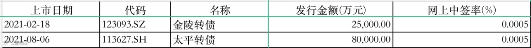太平转债、金陵转债网上中签率均为0.0005%,可谓“二十万里挑一”,成为今年上市发行最“抢手”的可转债。