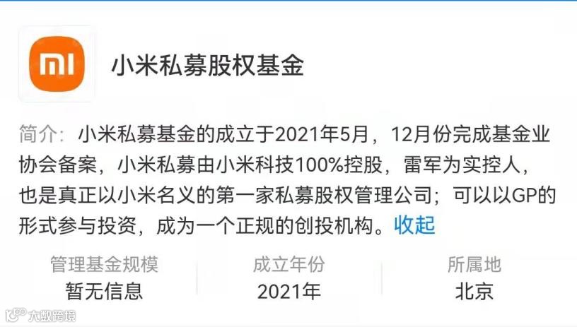 基金业协会信息显示,小米私募基金成立于2021年5月,注册资本11亿元,机构类型为私募股权、创业投资基金管理人,管理规模在0-5亿元之间,雷军为公司实际控制人。