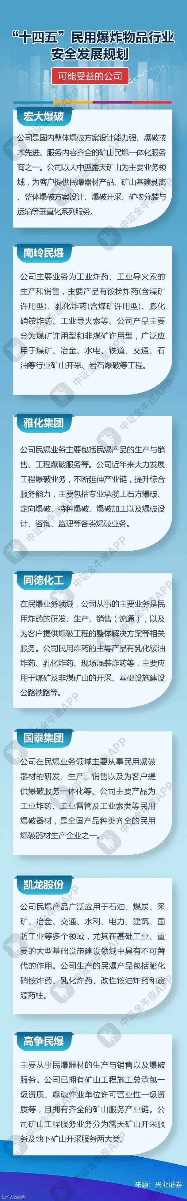 《规划》提出“十四五”期间的行业发展目标,包括产业集中度持续提高,企业数量进一步减少,形成3-5家具有较强行业带动力、国际竞争力的大型民爆一体化企业(集团);产能布局更加合理,产品结构更加优化,产能严重过剩矛盾得到有效化解等。
