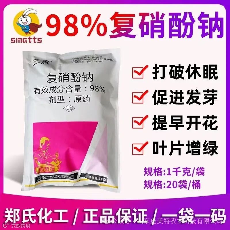 复硝酚钠(又名复硝基酚钠),是一种强力细胞赋活剂,化学成份为5-硝基愈创木酚钠、邻硝基苯酚钠、对硝基苯酚钠。与植物接触后能迅速渗透到植物体内,促进细胞的原生质流动,提高细胞活力。