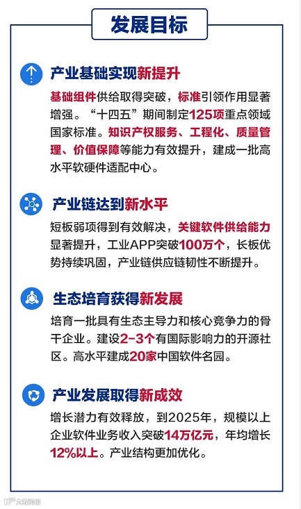 《“十四五”软件和信息技术服务业发展规划》提出,到2025年,规模以上企业软件业务收入突破14万亿元,年均增长12%以上。产业结构更加优化,综合实力迈上新台阶。