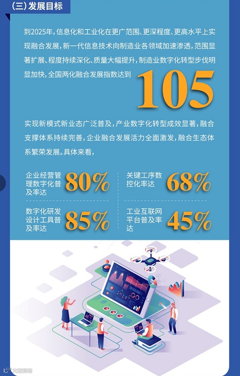 《“十四五”信息化和工业化深度融合发展规划》明确,到2025年,信息化和工业化在更广范围、更深程度、更高水平上实现融合发展,新一代信息技术向制造业各领域加速渗透,制造业数字化转型步伐明显加快,全国两化融合发展指数达到105,企业经营管理数字化普及率达80%,数字化研发设计工具普及率达85%,关键工序数控化率达68%,工业互联网平台普及率达45%。