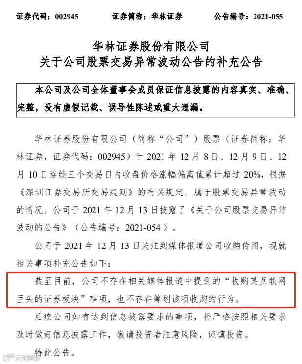12月14日早间,华林证券发布澄清公告称,并不存在相关媒体报道中提到的“收购某互联网巨头的证券板块”事项,也不存在筹划该项收购的行为。受此影响,华林证券开盘大幅跳水,最终以跌停收盘。