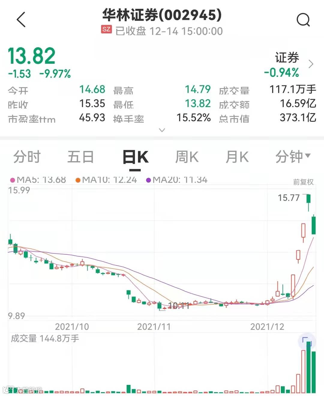 12月14日,华林证券股价大幅下挫。中证金牛座APP行情显示,截至收盘,华林证券封死跌停,股价报13.82元,全天共成交16.59亿元,换手率为15.52%。收盘时跌停板上仍有3多万手卖单。