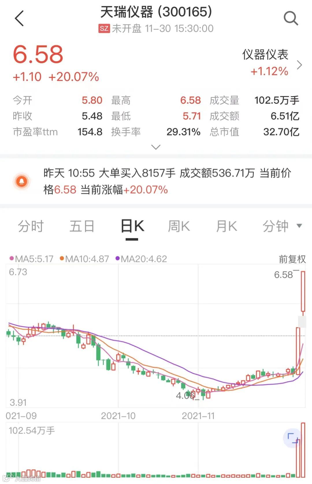 中证金牛座APP数据显示,天瑞仪器连续两天涨停,股价累计上涨43.98%。截至11月30日收盘,天瑞仪器报6.58元/股,市值32.7亿元。