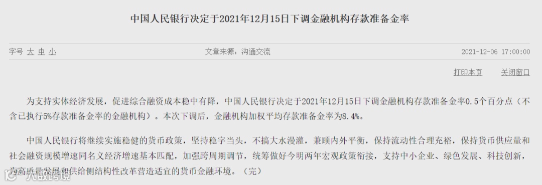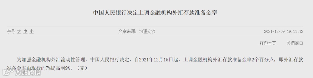 12月6日,人民银行宣布将下调金融机构存款准备金率。12月9日,人民银行又宣布将上调金融机构外汇存款准备金率。